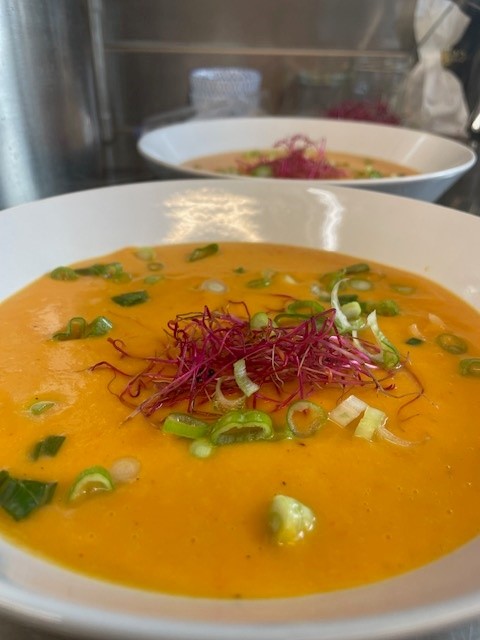Süßkartoffelcremesuppe (laktosefrei) mit Brot 7,90€