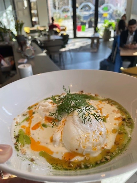 Shakshuka mit 2 pochierten Bio-Eiern, dazu Brot 11,90€